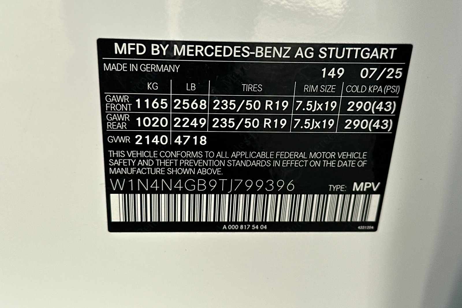 - VIN : W1N4N4GB9TJ799396